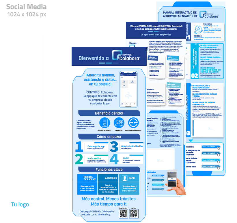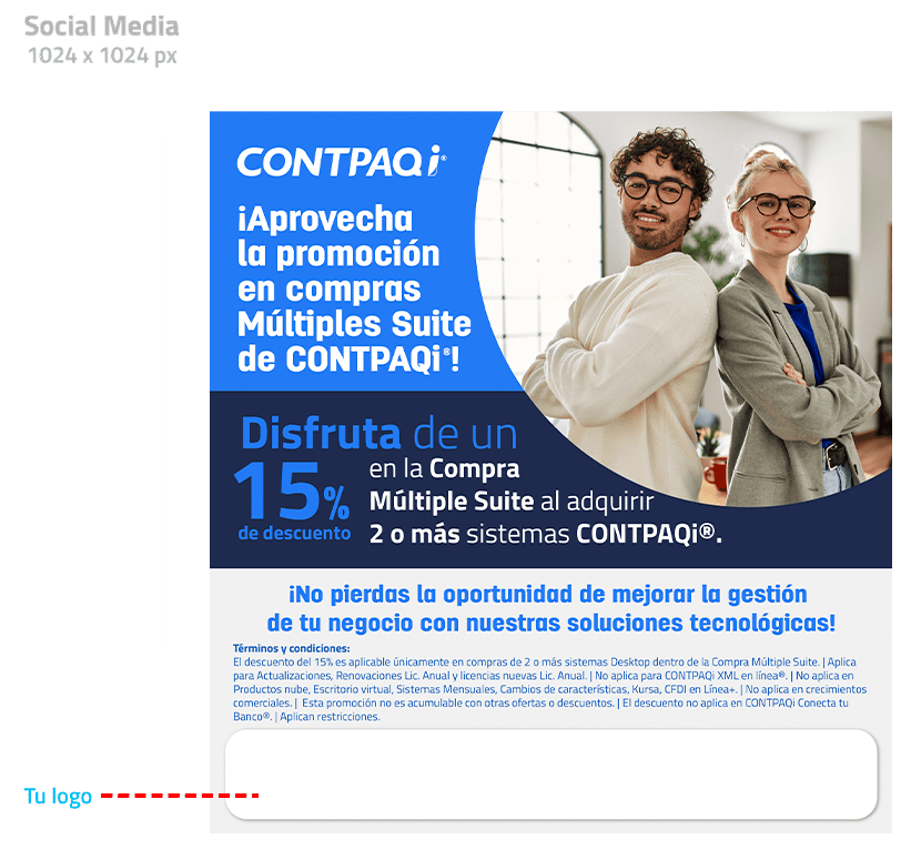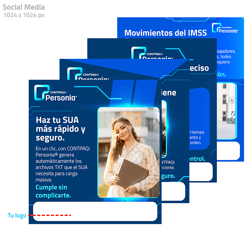 Piezas de campaña para redes sociales estáticos mostrando cómo hacer uso de la imagen de CONTPAQi® en compañía de la propia. Los archivos están están en .psd en capas y .jpg